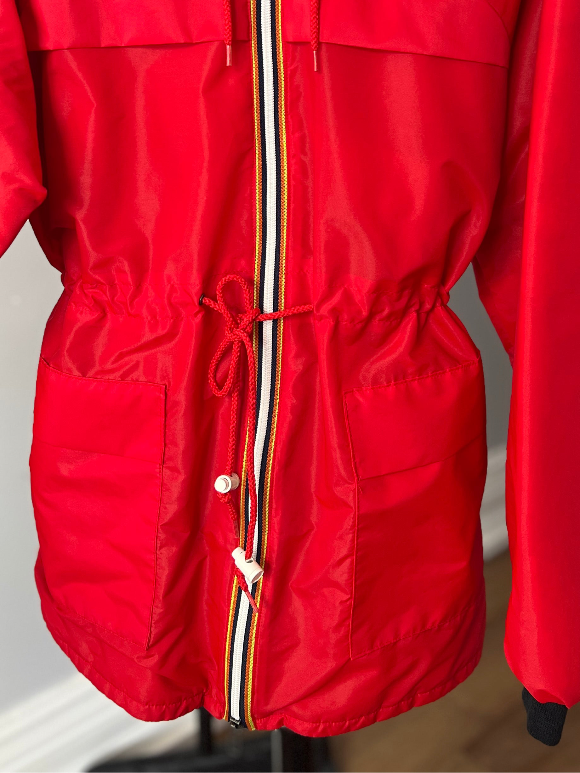 This vintage K-Way lined jacket in vibrant red is a true retro treasure! Featuring a tapered drawstring waist for a flattering fit and a soft lining for added comfort, this jacket is both stylish and functional. In excellent condition with no flaws, it’s like new and ready to wear.